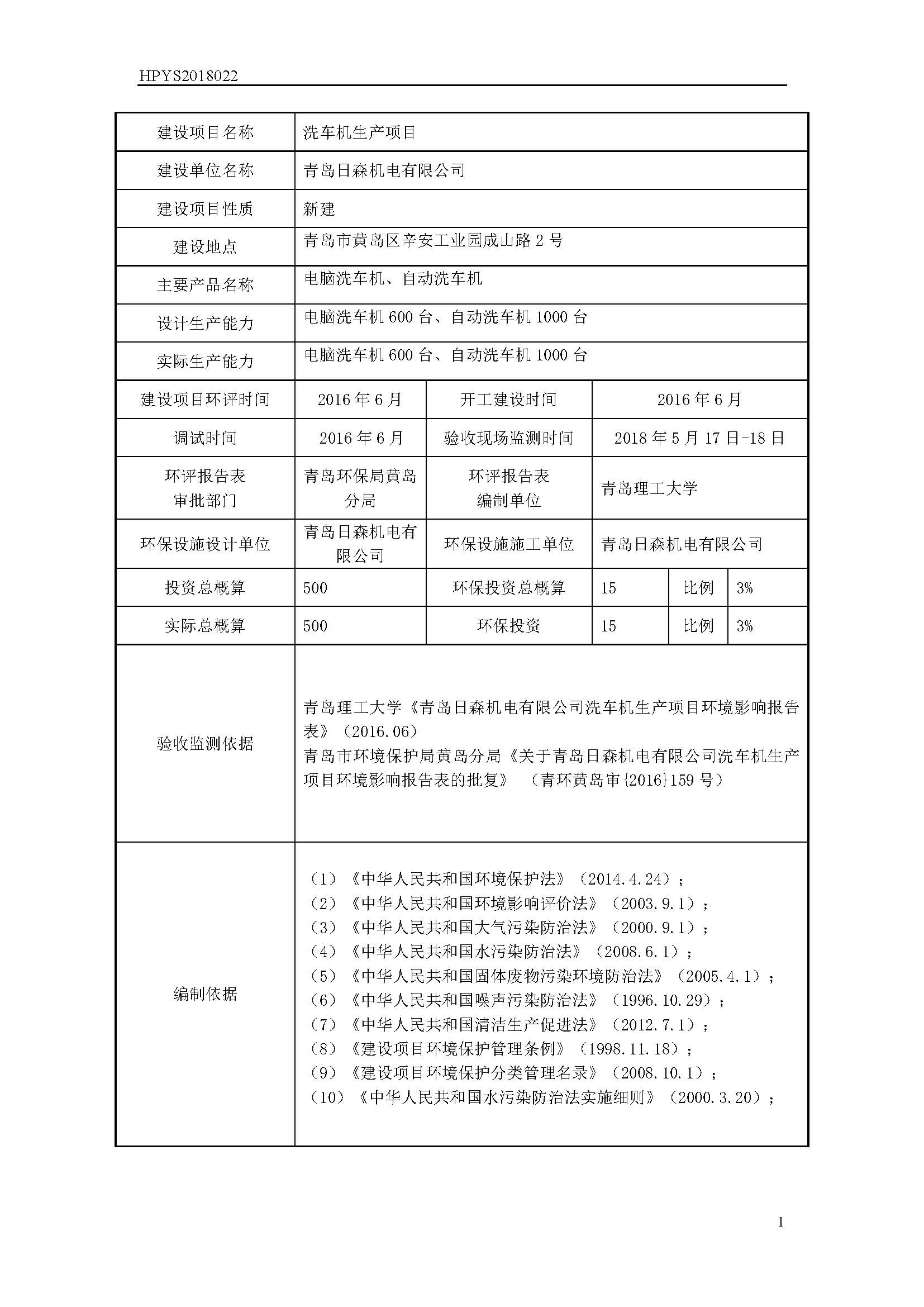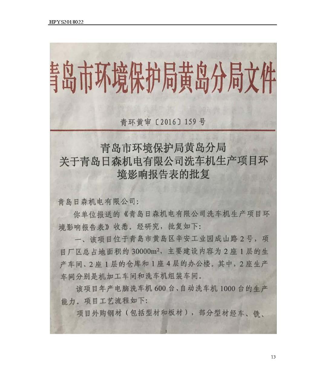 根據《國務院關於(yú)修改〈建設項目竣工(gōng)環境保護管理條例〉的決定》(國務院令第682號),以及環(huán)保部《關於發布《建設項目竣工環(huán)境保護驗收技術(shù)指南 汙染影響類》的公告》(國環規環評[2018]9號),現將青島日森機電(diàn)有限公司(sī)洗車機生產項目環境(jìng)保護(hù)竣(jun4)工驗收情況公示如下: