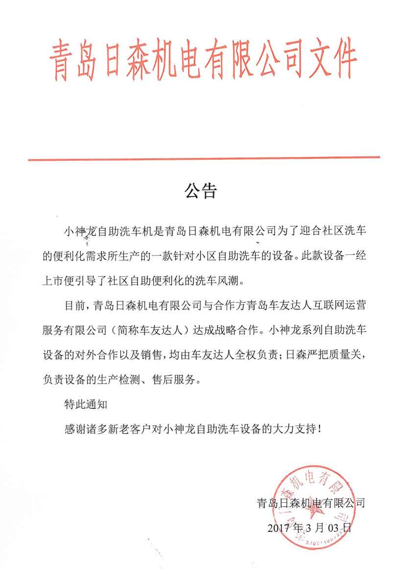 關(guān)於車友達人合作小神(shén)龍自(zì)助洗車機的公告