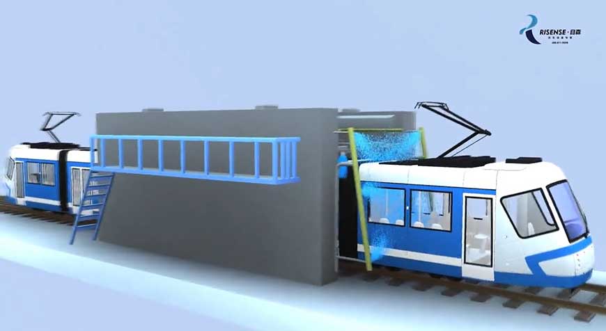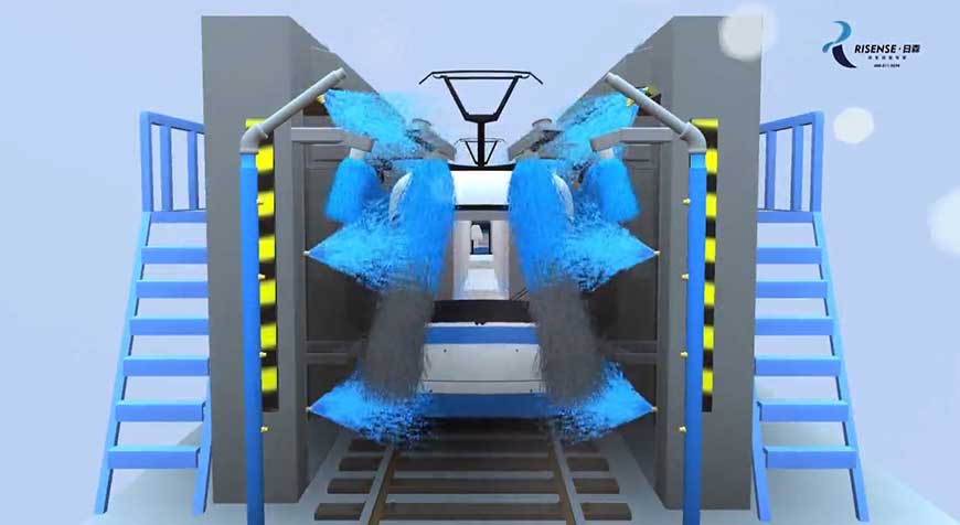 3、增加了清洗車頭和車尾的功能。我公司針(zhēn)對城軌電車的頭-尾的流(liú)線外形,設計了仿形清洗技術。